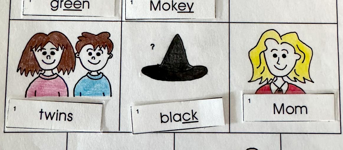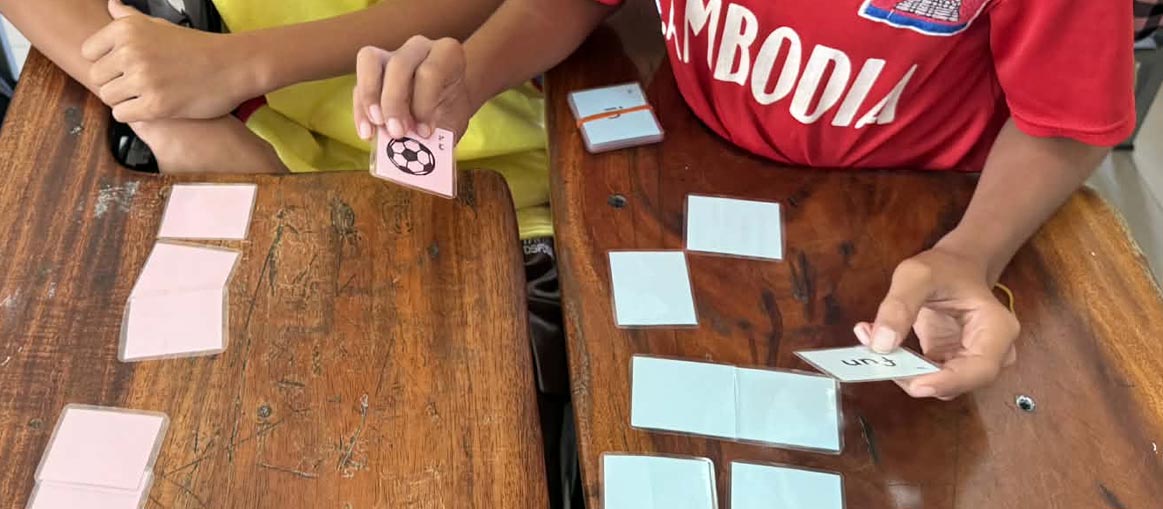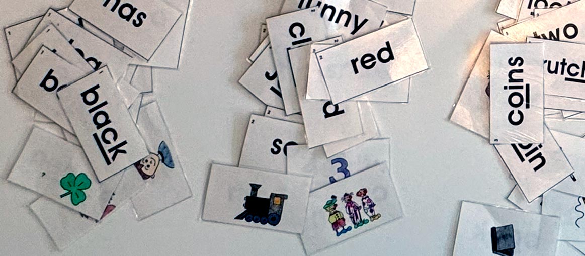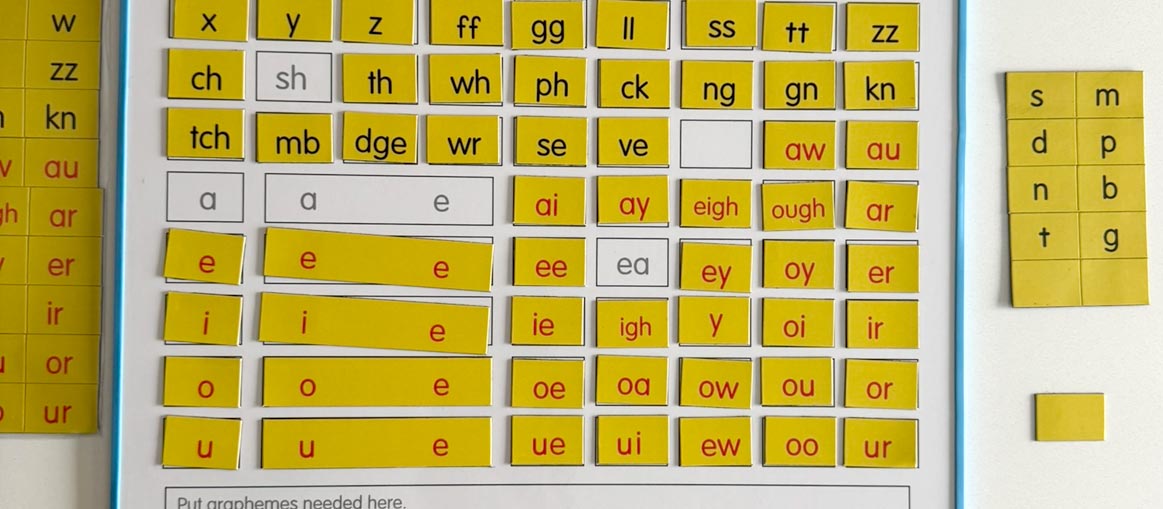 Students read together in pairs the words and graphemes on cards. Cards are self-correcting with a picture of the word on the back. They take turns being the teacher and testing their knowledge.