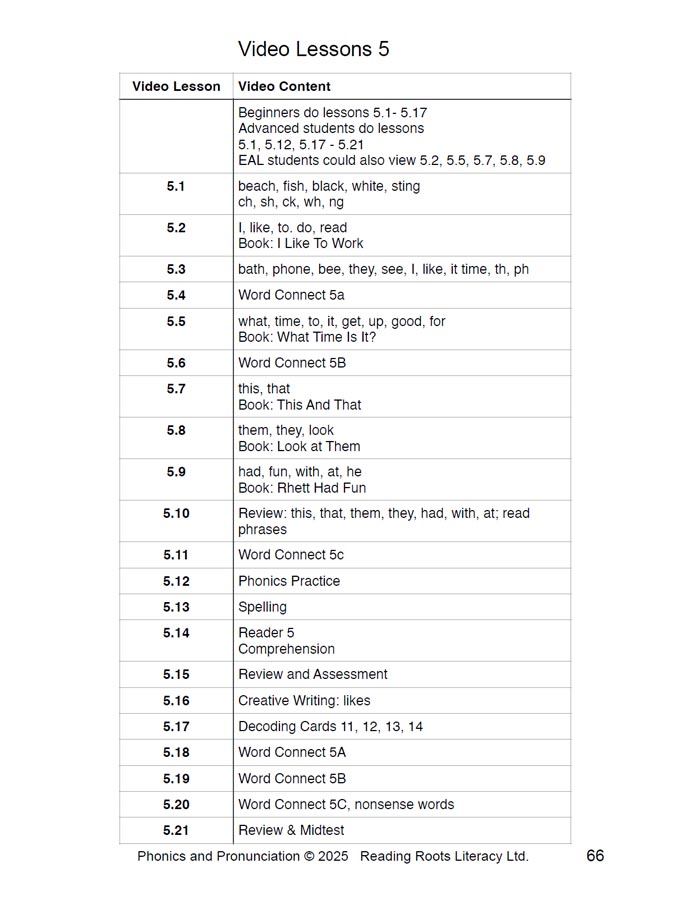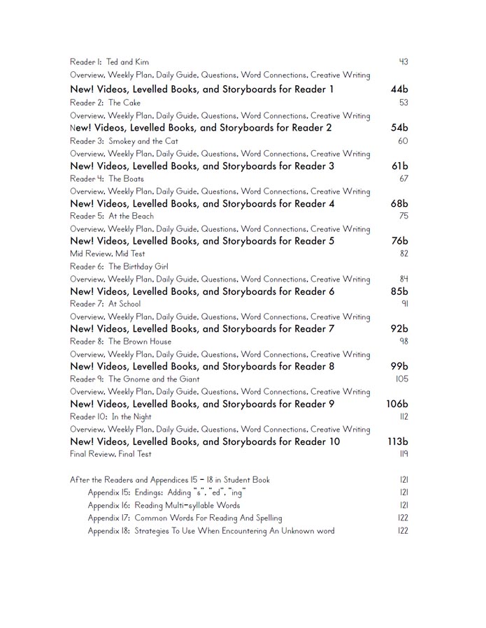 Features an overview, weekly plan, daily guide, comprehension questions, word chains, creative writing, when to use videos and storybooks/boards.